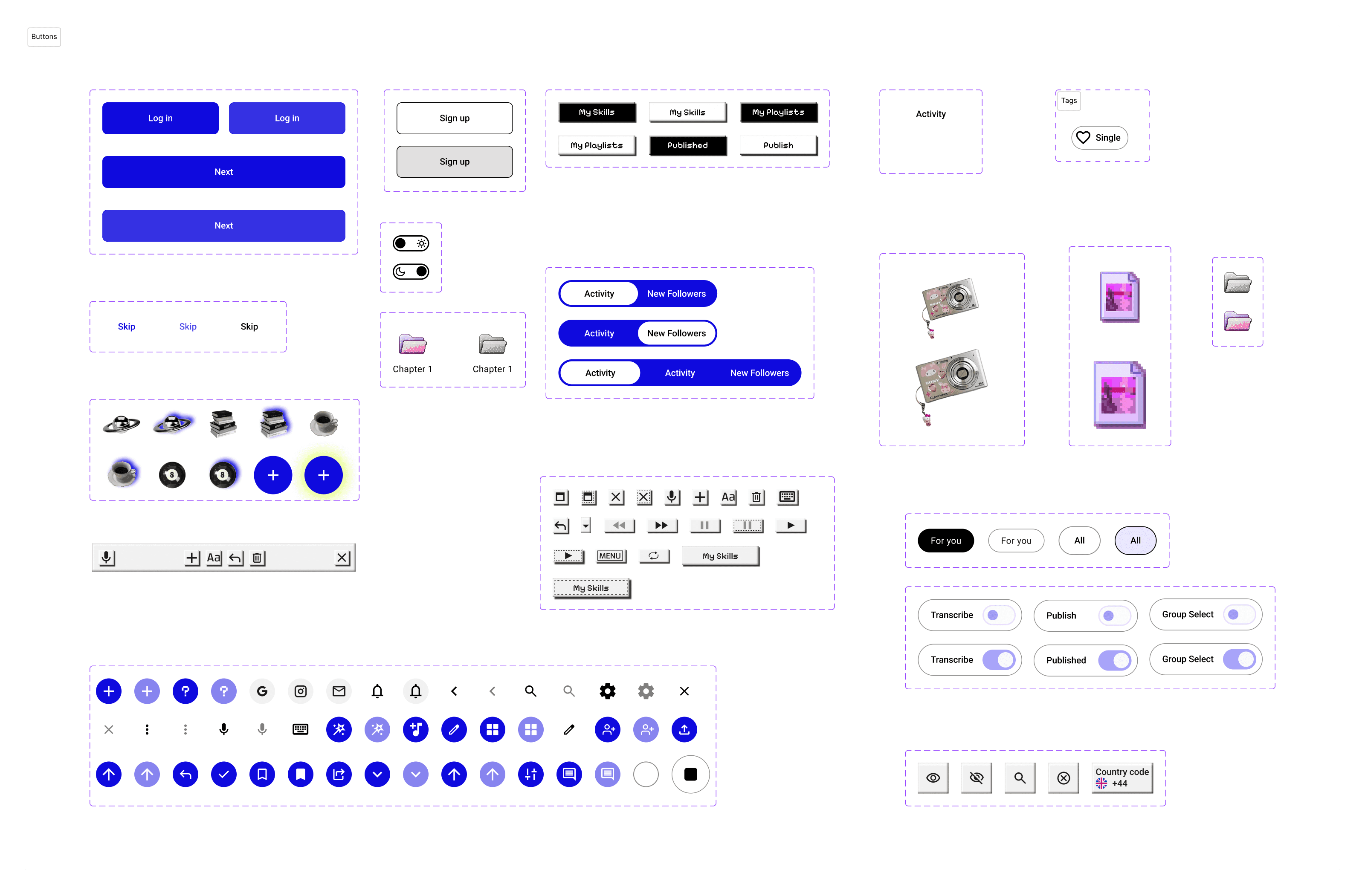 Mobile phones showing screens from the low-fi prototype: home, upload skill modal, add media, media gallery, selected media dashboard.